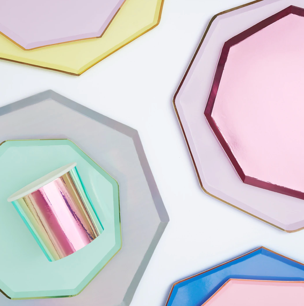 These lovely lilac side plates are the perfect addition to a party table setting. Made from high-quality card with a shiny gold foil border and superb gloss finish.