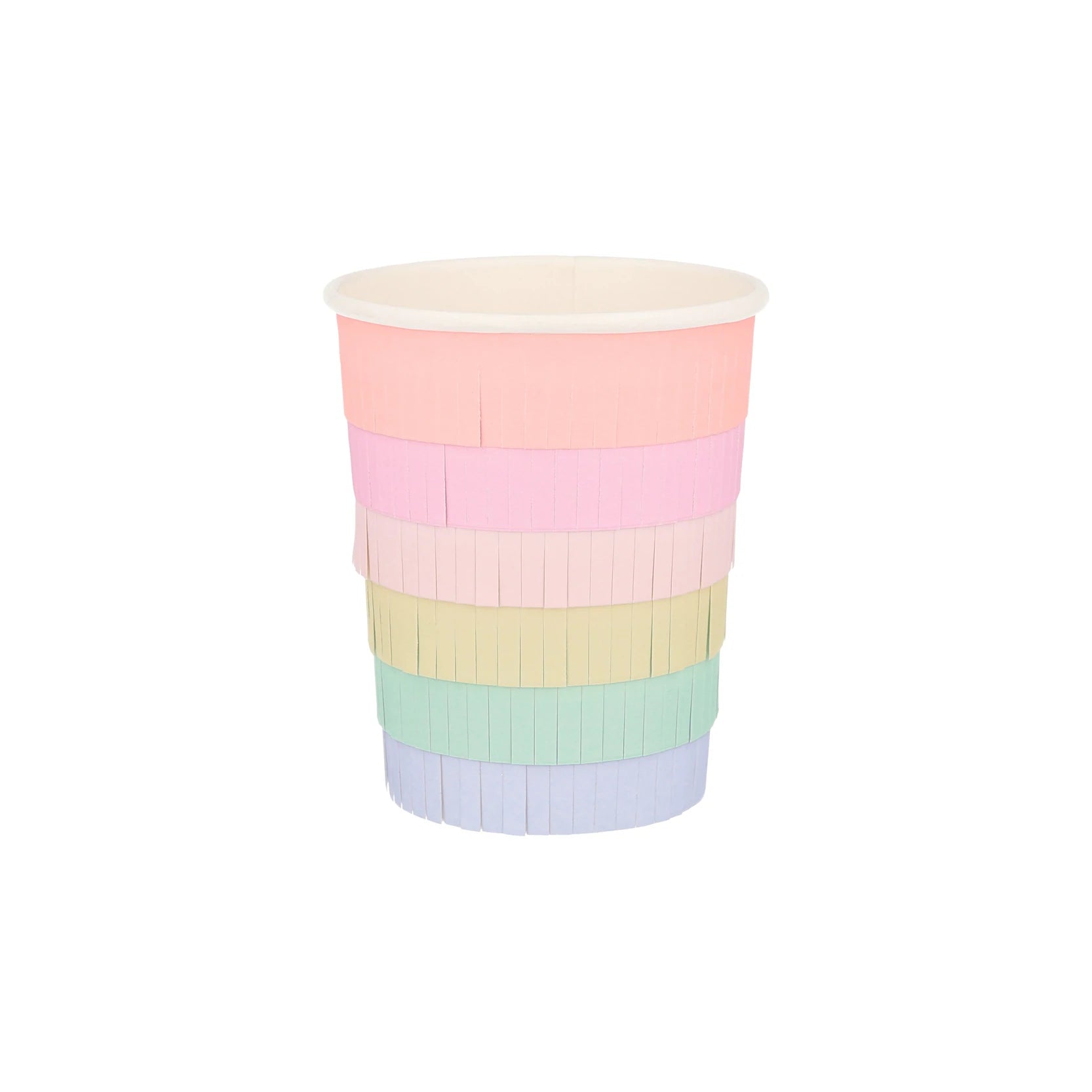 -The cups are covered in layered fringing, in neon coral, pink, pale pink, yellow, mint and blue