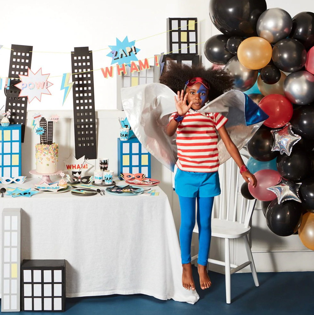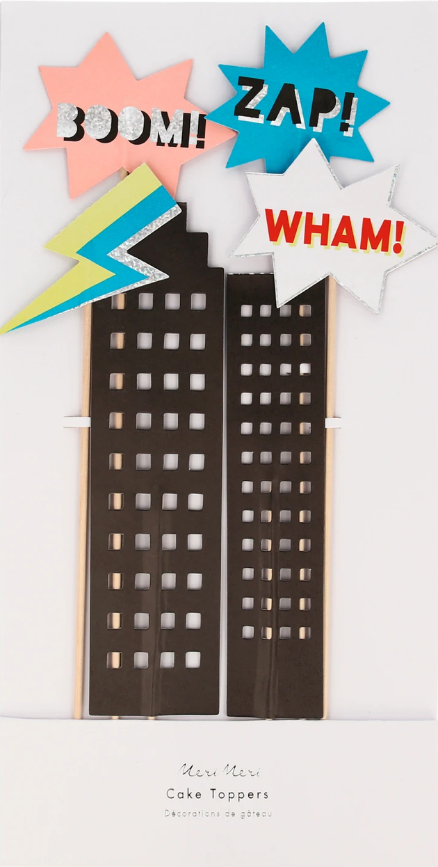 Transform a celebration cake into a superhero world of wonder with this fabulous set of cake toppers. They feature towering skyscrapers with cut out windows, a lightning bolt, and classic comic book words, "Boom!", "Zap" and "Wham!".